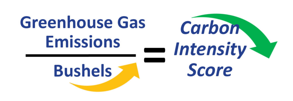 For crops like soybeans, carbon intensity, or CI, converts any greenhouse gas emissions to grams of CO2 equivalent per bushel grown.