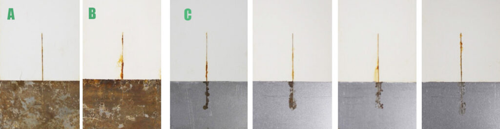 The products with soy-based ingredients are performing just as well, if not better, than those with a petroleum base. For example, Hense and her team explored solvent-based formulations for painting on metal and saw improved corrosion resistance with the soy-based paints. They painted steel samples with two commercially available primers and primers developed at Stonebridge with soy-based resins and solvents formulated to reduce the VOCs. They then exposed the samples to a salt spray for 1,000 hours to corrode the metals. The paints were then removed to expose the metal underneath. The soy-based paints had much better corrosion protection than the others (Figure 1).