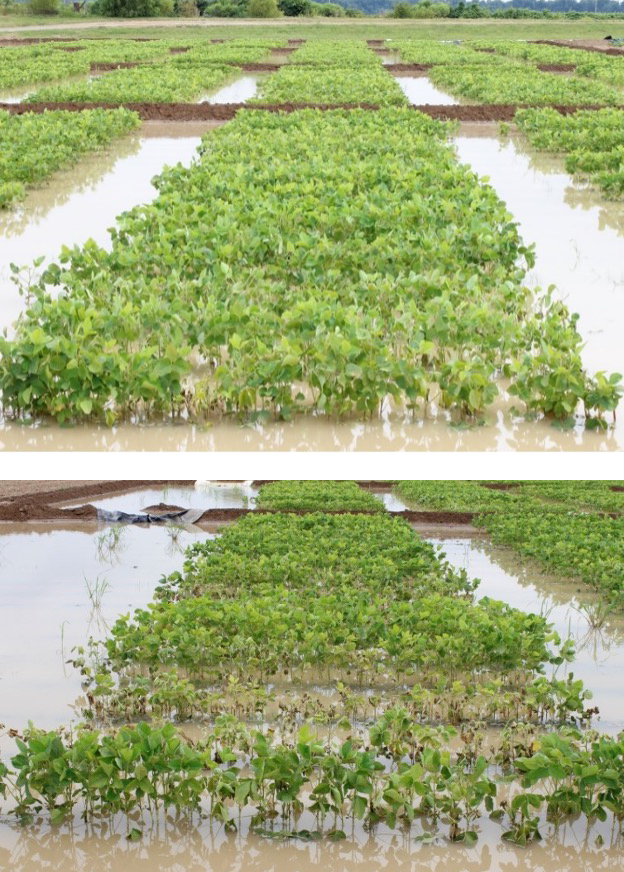 “If the conditions are cool and cloudy while the soybeans are waterlogged, damage is minimal,” he explains. “When the flood is held during hot, sunny weather, we see lots of yield loss.”